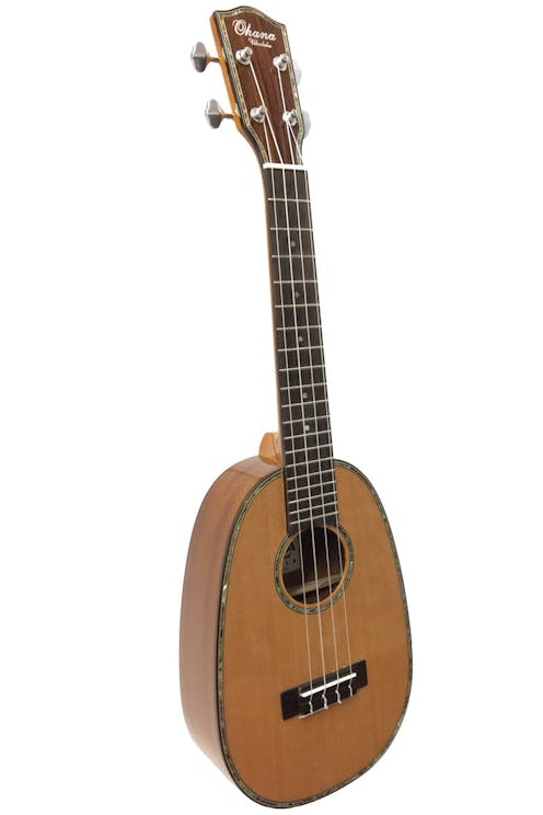 Pineapple shaped concert ukulele with a solid cedar top and solid mahogany back and sides. With an attractive gloss finish.