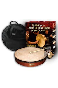Waltons bodhrans are made in Dublin by this long established company. The skins are goat and they are held in place with a strip of wood under the tacks giving a very neat appearance. Pack includes, beater, DVD and cover.