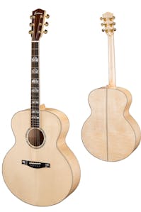 All Solid timber Eastman Jumbo Guitar with solid Engleman Spruce Top, and Solid flamed maple back and sides. Finished off with an all gloss Nitrocellulose finish and all gold hardware. Make a musical statement that can’t be ignored with the bold and booming nature of a jumbo guitar. Up to 17 inches at the lower bout, these guitars speak loudly and resonate deeply. Maple is an ideal choice for the back and sides, as it helps bring the loudest voice in the room into beautiful focus, both sonically and visually. Supplied in a Deluxe Eastman hard case.