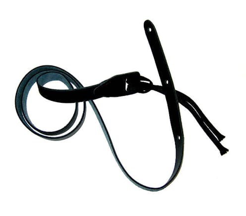 Genuine leather mandolin strap for 'F' style and other mandolins ...In soft brown leather. This unique strap has a slotted end to enable a loop to be hung around the scroll of an 'F' style mandolin. The strap has a series of punched holes to allow adjustment for length.