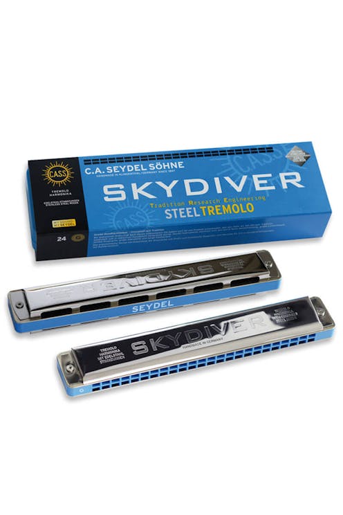 The SKYDIVER STEEL TREMOLO offers an incredible musical presence and assertiveness while providing a subtle and sweet tremolo sound. The tuning on the SKYDIVER is the most commonly used tuning of tremolo harmonicas