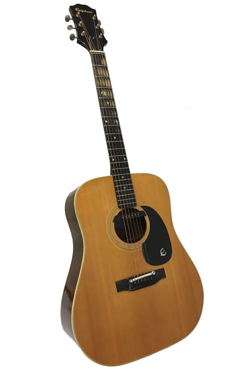 - Open-book or traditional headstock with scripted "Epiphone" logo