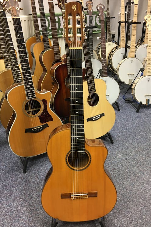 Quality electro classical guitar from top spanich luthiers Prudensio Saez. This guitar features a solid German spruce top with a stunning cocobolo back and sides, mahogany neck, ebony fingerboard. 48mm nut width so fairly narrow for a classical. Its more of a hybrid guitar. Features a Fishman classical preamp and pickup system. Supplied in a quality Cibeles carbon fibre hard case. Commission Sale