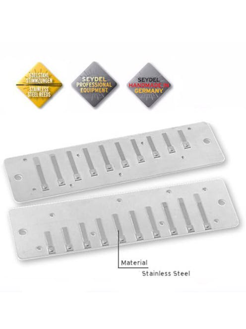 Set of spare reedplates fit for 1847 CLASSIC, SILVER (not SILVER+), NOBLE, Favorite and Solist Pro. All key variants ranging from LLE to HBb with stainless steel reeds