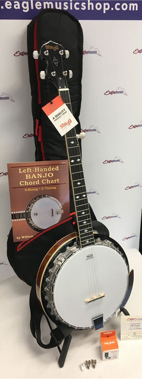 All you need to start playing for the left hander! Basic 5 string Stagg BJM30 beginners banjo pack. Features a left handed 5-String Banjo, padded gig bag with shoulder straps, left handed chord chart, chromatic 'clip on' electronic tuner, fitted shoulder strap, spare set of strings, left handed thumb pick & a pair of nickel finger picks. (Stand not included).
