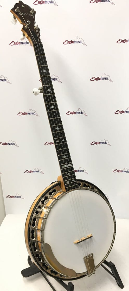 1978 Stelling 'White Star' 5 String Banjo. Superb condition for nearly 40 years old. Its been really well looked after and has a killer tone. Feature a Stelling block rim, Stelling adjustable tailpiece, 25 round hooks and nuts, knotched tension hoop, ebony fingerboard, signature Stelling headstock shape, New Remo head and NEW strings. Spikes fitted at 7,8,9 and 10th fret. This banjo has had a full professional Eaglemusic setup! Supplied in a Stelling hard case. Commission Sale